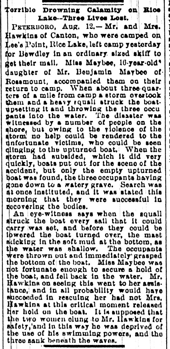 - [S66] Submission by Steve Mabie, Maybee Society Member No. 257., Port Hope Weekly Guide, 8/14/1891, page 1, column 4.